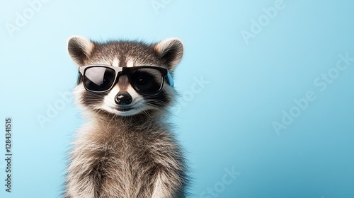 © Velar, Fototapeta premium In a lighthearted moment, a raccoon dons fashionable sunglasses and poses against a bright blue background