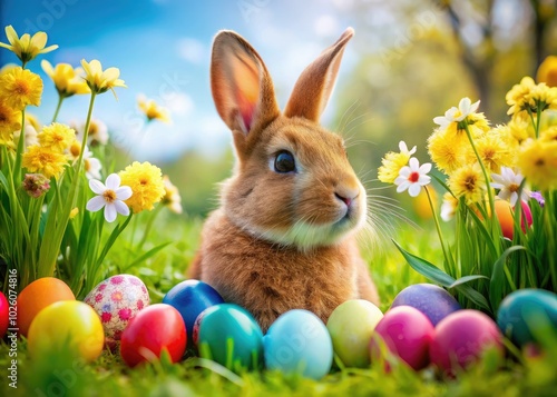 © kittipon, Fototapeta premium In a lively meadow filled with blooming flowers, a colorful Easter bunny plays amidst beautifully decorated eggs, embodying the spirit of spring and renewal.
