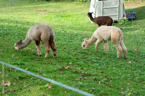 © Niko_Dali, Obraz premium In a lush green field surrounded by nature, alpacas graze peacefully, basking in the warm, golden sunlight of the autumn season