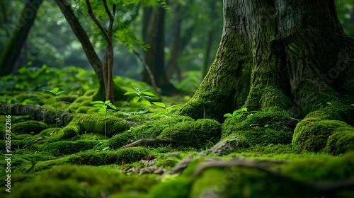© Musarat, Obraz premium In a magical forests enchanting tree trunks surrounded by vibrant green mossy grow
