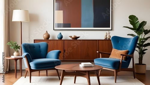 Fototapeta premium In a mid-century interior design of a modern living room, a blue armchair...