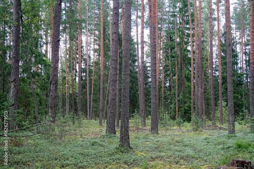 Obraz premium In a ripe pine forest, lingonberry patches. Summer. Tall trees.