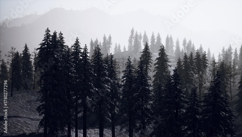 Naklejka premium In a serene winter scene, tall pine trees loom in silhouette against a misty...