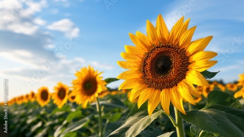 © Babb, Fototapeta premium In a sprawling field, bright sunflowers stand tall, their golden petals glowing in the warm sunlight. The clear blue sky enhances the beauty of this late summer day