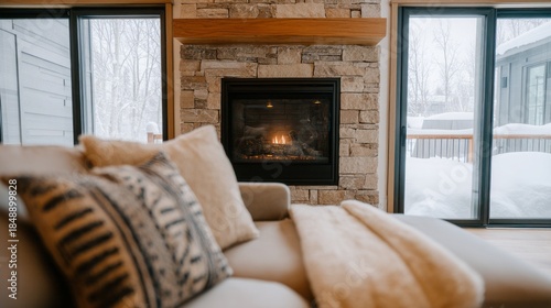 Obraz premium In a stylish living room, a stone fireplace crackles softly while snow gently blankets the outside world. Plush cushions and a soft throw invite relaxation during this serene winter day