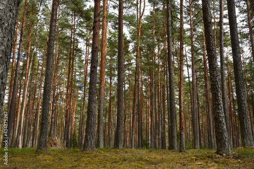 Obraz premium In a summer forest with masted pines, looking from the bottom up, light...