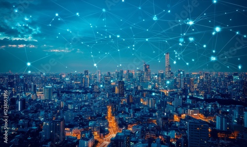 Fototapeta premium In a , the advanced urban landscape of a futuristic city is portrayed, emphasizing cyberspace, neural networks, big data streams, and the dynamic flow of information.