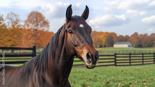 Fototapeta premium In a tranquil countryside farm under a blue sky, a sleek brown horse...