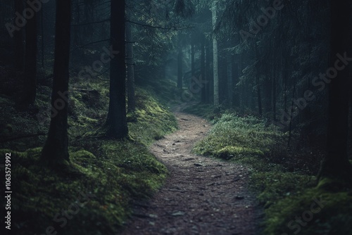 © ChaoticMind, Naklejka premium In a tranquil, darkened forest, a shadowy path promises an enigmatic journey, wrapped in the mystique of nature, echoing peace, solitude, and introspection.