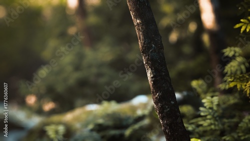 Fototapeta premium In a tranquil forest, warm sunlight dances upon the surface of a sturdy tree...