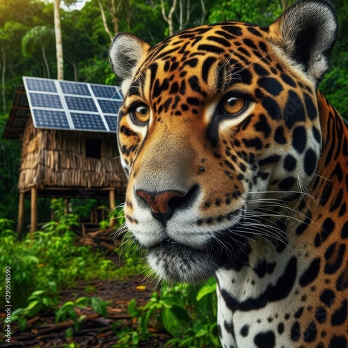 © Pavel Lysenko, Obraz premium In a vibrant green rainforest, a stunning jaguar stands majestically, observing its surroundings near a rustic shelter adorned with solar panels. The sun casts a warm glow
