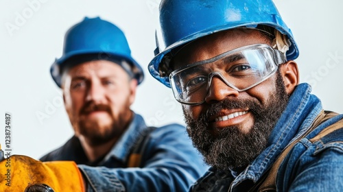 Fototapeta premium In an inspiring moment, two construction workers wear blue helmets and protective gear, ready to tackle the day's challenges with a confident and determined expression.