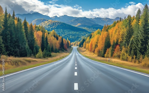 Fototapeta premium In autumn, turn onto the forest road