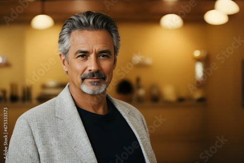 © Rahul, Fototapeta premium In bright modern office, senior mature handsome hispanic businessman with large smile.