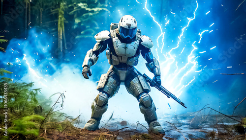 © Vadim, Fototapeta premium In comic book style astronaut, alien, robot in armored spacesuit in action. Starship troopers, star wars, space exploration, space science