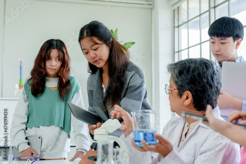 © Ekkasit A Siam, Fototapeta premium In elementary school science classroom, elderly teacher is guiding young students about science experiment. Compare with example on laptop computer. Children interested in learning, learning concept