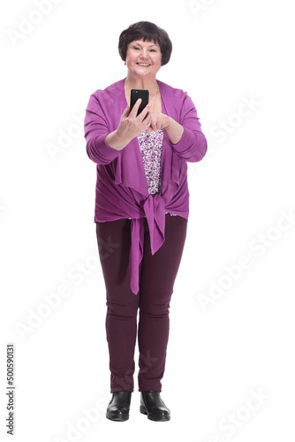 Obraz premium in full growth.casual an elderly woman with a smartphone.