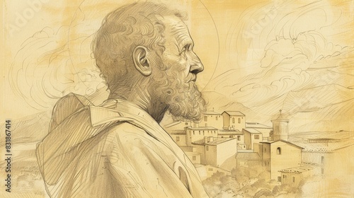 © T Studio, Fototapeta premium In Reflection, St. Ambrosio with 16th-Century Spanish Village, Biblical Illustration, Beige Background, Copyspace