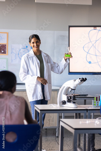 © wavebreak3, Obraz premium In school, Indian female teacher holding flask and explaining science experiment to students