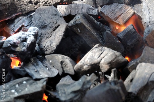 © Oradige59, Fototapeta premium In selective focus firewood with hot coals from burning small wood logs in a stove
