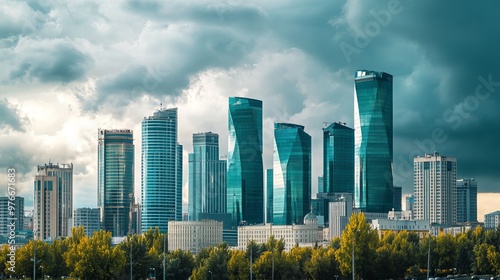 © Yusif, Fototapeta premium In September 2019, the downtown of Astana, Kazakhstan, features a variety of skyscrapers and government buildings set against a cloudy sky.