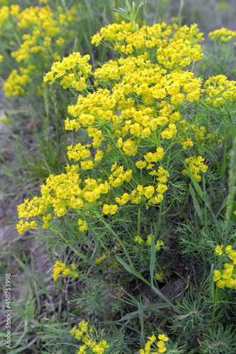 Obraz premium In spring, Euphorbia cyparissias blooms among herbs