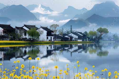 © fanjianhua, Fototapeta premium In spring, rapeseed flowers bloom, and houses by the lake