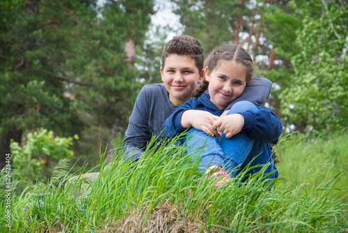 Fototapeta premium In summer, a brother and sister sit on the grass in the forest.