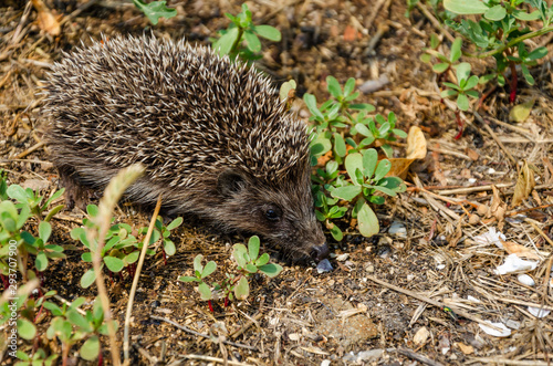 © Сергей Лаврищев, Fototapeta premium In summer, a small hedgehog crawls in the grass.