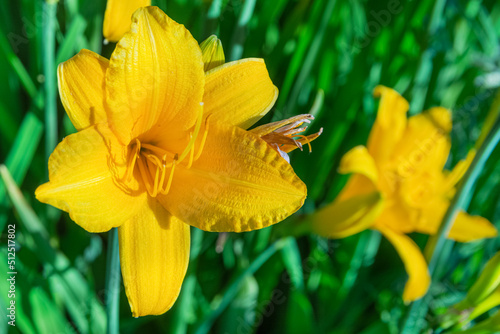 Fototapeta premium In summer, large yellow lilies bloom in the garden. Macro