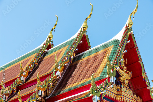 Fototapeta premium In Thailand most Buddhist temples are made using a lot of gold leaf-covered ornaments. The building itself is usually white with a tri-coloured roof in red, green and orange/dark yellow.