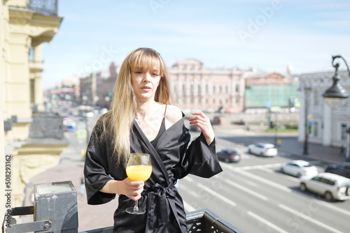 Fototapeta premium In the afternoon, in the light of the sun, a touching girl in black pajamas enjoys a glass of orange juice. She's good on the balcony.