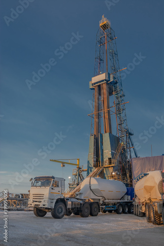 © mangz, Obraz premium In the background, a drilling rig in the northern oil and gas field. In the foreground is a grouting technique for cementing a casing in a well