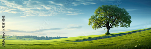 Obraz premium In the center of a vast grassy field, there stands a solitary tree, providing...