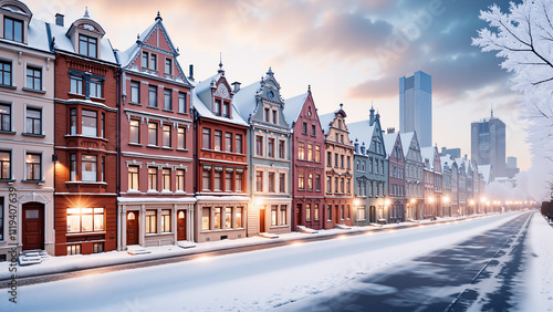 Naklejka premium In the city with old buildings, in winter, covered with snow. Winter...