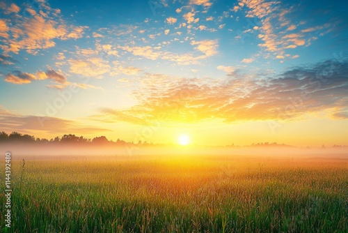 © Антон Сальников, Obraz premium In the early summer morning, a path winds through a foggy field of diverse blooming wildflowers, while the sun rises above the horizon in the mist.
