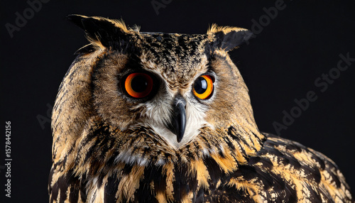 © Amilia, Fototapeta premium In the Eyes of Wisdom: Close-Up of Owl’s Face with Sharp Eyes Under Studio Lighting and Clean Black Background