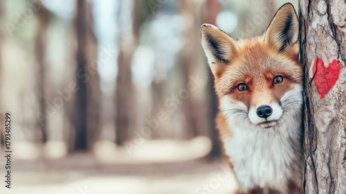 © Bonsales, Obraz premium In the forest, a charming fox is playfully peeking out from behind a tree trunk adorned with a vivid red heart, symbolizing love, wonder, and the beauty of nature