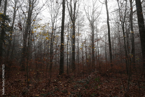© leomalsam, Fototapeta premium In the forest on a foggy autumn morning