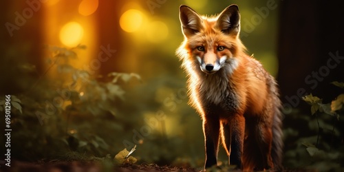 © Omtuanmuda, Fototapeta premium In the forest's hush, a fox's gaze captures the fading light.