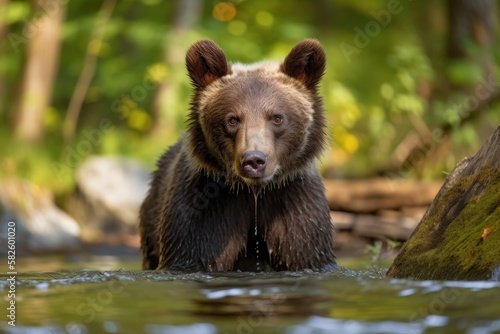 © AkuAku, Fototapeta premium In the forest, there is a brown bear. Generative AI