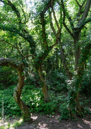 Fototapeta premium In the forest, twisted trees draped in ivy create an enchanted atmosphere