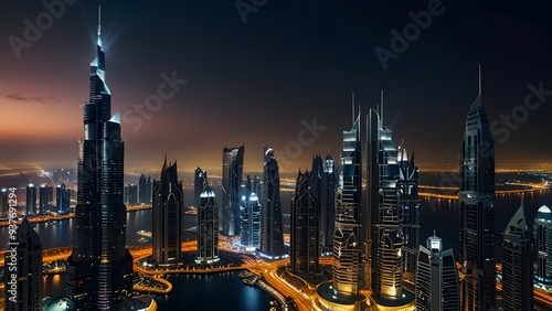 © Rashid, Fototapeta premium In the glittering darkness of a nocturnal Dubai, a futuristic cityscape comes alive with vibrant lights and sleek skyscrapers