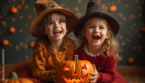 © Pixel Plaza Graphic, Fototapeta premium in the haunted and foggy forest children with pumpkins laughing and cheerful