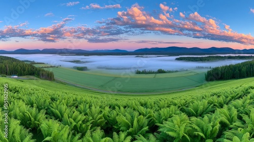 © Georgy, Fototapeta premium In the heart of Serene Valley, a picturesque vista emerges, complete with lush ferns, a mist-shrouded forest, and a dazzling blue sky above