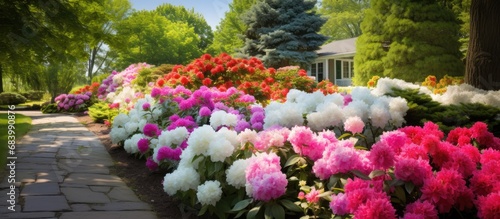 © AkuAku, Obraz premium In the midst of a vibrant garden, a skilled designer carefully arranges an array of colorful flowers, showcasing the natural beauty of spring and summer. The garden is filled with a mixture of white