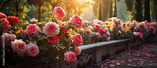 © AkuAku, Obraz premium In the morning light of a summer day, nature came alive with vibrant hues of green foliage and colorful floral displays of roses, pink petals dancing in the breeze, as the vibrant red blooms added a