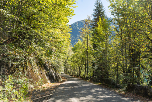 Fototapeta premium In the mountains, along a narrow road running alongside a deep, forested gorge, lies the path to Lake Ritsa. The journey takes place on a warm autumn day.