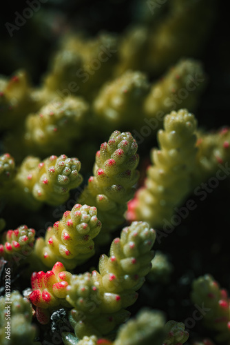 © Sergio Amate, Fototapeta premium In the realm of the minuscule, a macro lens reveals the intricate beauty of a succulent, unveiling its mesmerizing patterns and luscious textures