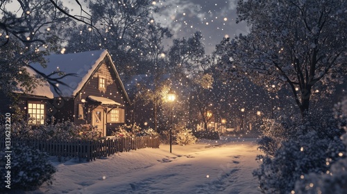 © wicha, Naklejka premium In the silence of the evening, the gentle embrace of falling snow creates a peaceful and calming atmosphere, turning the world into a winter paradise
